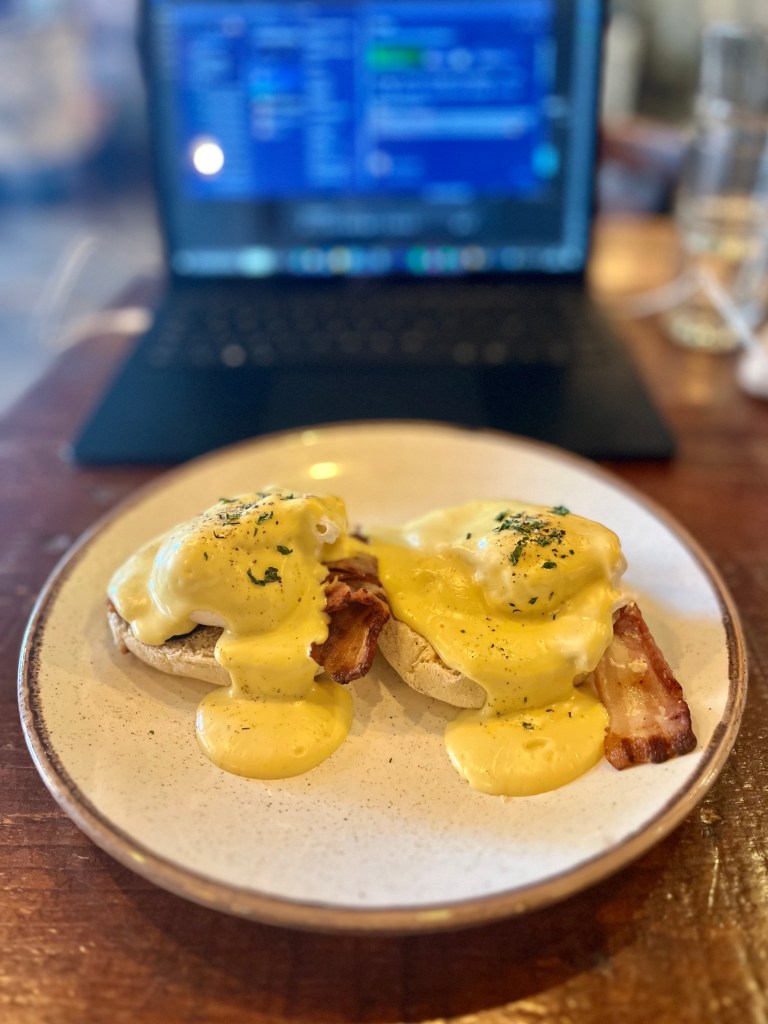 As we settled in, we took advantage of their fantastic deal: unlimited coffee paired with a delicious brunch for only £12! I opted for the classic Eggs Benedict, and it did not disappoint. The environment was vibrant yet conducive to work, with just the right amount of background music to keep us energised without being distracting.